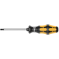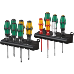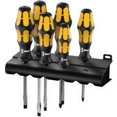 Juego de destorcinceles de Wera para atornillar, cincelar, escoplear y soltar tornillos agarrotados de TORX® interior. Con el mango multicomponente Kraftform para un trabajo rápido y ergonómico. Con varilla hexagonal pasante elaborada de material de puntas de alta calidad lo cual proporciona una transmisión de la fuerza sin pérdidas, incluso en el caso de golpes de martillo. Elaborado de un material bonificado resistente y duro para evitar astillamientos o la rotura de la varilla. Con caperuza de golpe integrada para aumentar la vida útil y reducir el peligro de astillamiento. Gracias a la llave hexagonal auxiliar integrada y por medio de llaves de boca o anillo, se pueden transferir unos pares de giro más altos. La punta Black Point de Wera así como un procedimiento de endurecimiento sofisticado garantizan una larga vida útil de la punta, una mayor protección anticorrosiva y una gran exactitud de posicionamiento. El sistema de protección contra el rodamiento mediante hexágono evita las molestias que conlleva el perder la herramienta que se rueda en el puesto de trabajo.