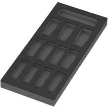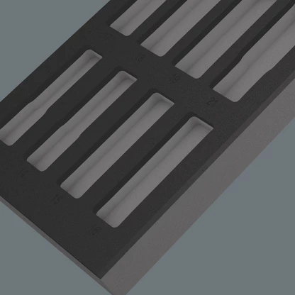 Un depósito de espuma resistente, sin herramientas; con aspecto bicolor para reconocer rápidamente si faltan piezas; ancho x alto x profundo: 172 x 30 x 392 mm; depósito de espuma de repuesto para el artículo 9725 de Wera; adecuado para el carro de herramientas para el taller Tool Rebel.
