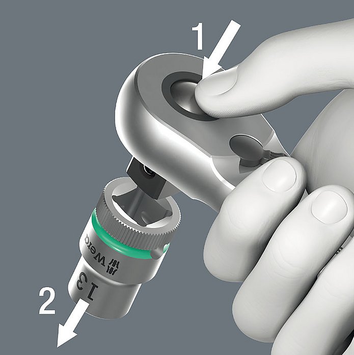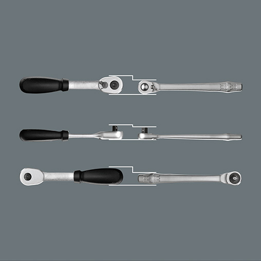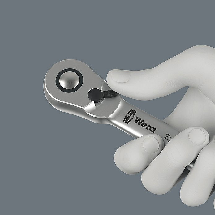 Wera Zyklop Metal Switch – extremadamente delgada, robusta y flexible. Con palanca reversible para cambio rápido de dirección, fijación segura del vaso y ángulo de retorno de 5° – ideal para espacios reducidos.