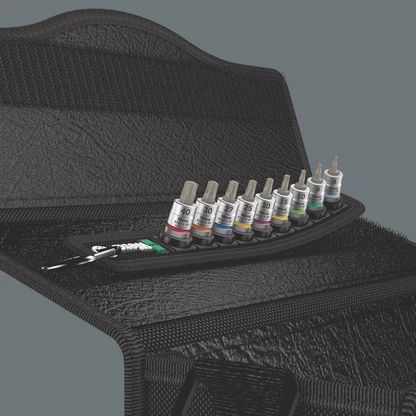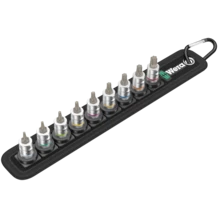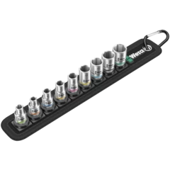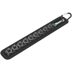 Una correa textil robusta (Belt) en el típico diseño de Wera con 9 vasos de punta en un espacio muy reducido. El mecanismo de giro fácil y suave permite una sujeción segura así como una extracción muy fácil de los vasos. Dispone del sistema de búsqueda de herramienta Take it easy con marcación a color según el tamaño - para encontrar la herramienta precisa de forma sencilla y rápida. Incluye un mosquetón para la fijación de la correa en la trabilla del cinturón o en un bolso. Los vasos de punta son especialmente cortos y estables y disponen de las ventajas de la tecnología de Wera. Los vasos disponen de la función de retención para un trabajo de atornillar más cómodo, ya que se reduce el riesgo de que se pierda el tornillo al llevarlo hacia la pieza de montaje. Dispone de una superficie de fieltro en la parte posterior, y con ayuda de las cintas autoadhesivas es fácil sujetarla, por ejemplo, en la pared, la estantería, el carro de herramientas o el sistema de transporte de herramientas Wera 2go.