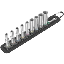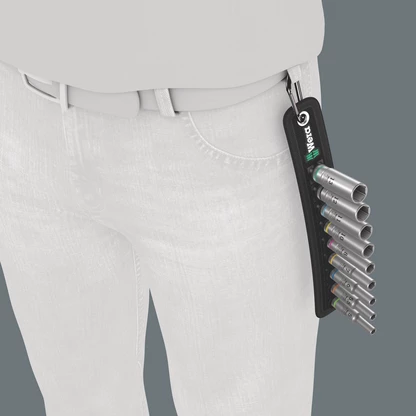 Una correa textil robusta (Belt) en el típico diseño de Wera con 9 llaves de vaso largas de ¼" para el uso manual y mecánico (no de impacto), en un espacio sumamente compacto. El mecanismo de giro de funcionamiento suave permite un depósito seguro y una extracción muy fácil de los vasos. Incluye un mosquetón para la fijación en el cinturón o en un bolso. La parte posterior con zona de fieltro y la cinta autoadhesiva sirven para una fijación fácil, por ejemplo en la pared, en la estantería, en el carro del taller o en los elementos del sistema de transporte de útiles Wera 2go. Llaves de vaso largas de ¼" para el uso manual o mecánico, (ISO 2725-parte 3) de Wera, para trabajos a mano o a máquina (no de impacto), incluso en uniones atornilladas que se encuentran a gran profundidad, o para varillas roscadas. Lleva el sistema de búsqueda de herramientas Take it easy: con marcas a color según el tamaño - para encontrar la herramienta precisa de forma más fácil y rápida. Con excelente agarre para un trabajo cómodo incluso con manos aceitosas. Con perfil hexagonal y ranura de retención de bola. El perfil hexagonal permite una transmisión de fuerzas muy elevadas y no significa una carga tan alta para los cantos de la tuerca o de la cabeza del tornillo como en el caso del perfil bihexagonal. Además, gracias a su ángulo de retorno tan pequeño, las carracas de dentado fino son ideales para los trabajos en espacios de montaje muy reducidos, así que también en estos casos ya no hace falta un perfil bihexagonal. Para tornillos y tuercas de hexágono exterior.
