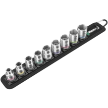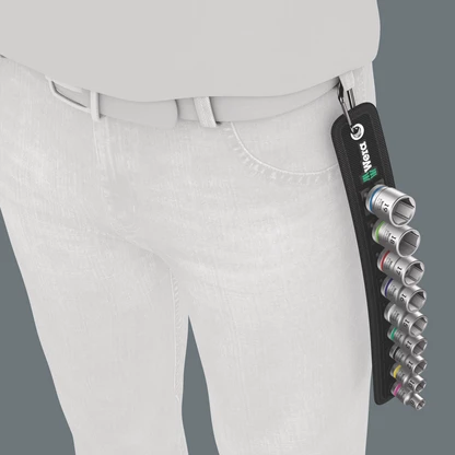 Una correa textil robusta (Belt) en el típico diseño de Wera con 9 vasos en un espacio muy reducido. El mecanismo de giro fácil y suave permite una sujeción segura así como una extracción muy fácil de los vasos. Dispone del sistema de búsqueda de herramienta Take it easy con marcación a color según el tamaño - para encontrar la herramienta precisa de forma sencilla y rápida. Incluye un mosquetón para la fijación de la correa en la trabilla del cinturón o en un bolso. Dispone de una superficie de fieltro en la parte posterior, y con ayuda de las cintas autoadhesivas es fácil sujetarla, por ejemplo, en la pared, la estantería, el carro de herramientas o el sistema de transporte de herramientas Wera 2go.