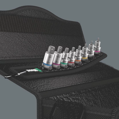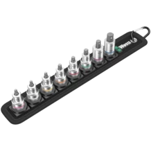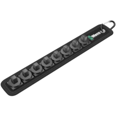 Una correa textil robusta (Belt) en el típico diseño de Wera con 8 vasos de punta en un espacio muy reducido. El mecanismo de giro fácil y suave permite una sujeción segura así como una extracción muy fácil de los vasos. Dispone del sistema de búsqueda de herramienta Take it easy con marcación a color según el tamaño - para encontrar la herramienta precisa de forma sencilla y rápida. Incluye un mosquetón para la fijación de la correa en la trabilla del cinturón o en un bolso. Los vasos de punta son especialmente cortos y estables y disponen de las ventajas de la tecnología de Wera. Los vasos disponen de la función de retención para un trabajo de atornillar más cómodo ya que se reduce el riesgo de que se pierda el tornillo al llevarlo hacia la pieza de montaje. Dispone de una superficie de fieltro en la parte posterior, y con ayuda de las cintas autoadhesivas es fácil sujetarla, por ejemplo, en la pared, la estantería, el carro de herramientas o el sistema de transporte de herramientas Wera 2go.