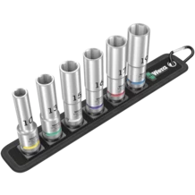 Una correa textil robusta (Belt) en el típico diseño de Wera con 6 llaves de vaso largas de ½" para el uso manual y mecánico (no de impacto), en un espacio sumamente compacto. El mecanismo de giro de funcionamiento suave permite un depósito seguro y una extracción muy fácil de los vasos. Incluye un mosquetón para la fijación en el cinturón o en un bolso. La parte posterior con zona de fieltro y la cinta autoadhesiva sirven para una fijación fácil, por ejemplo en la pared, en la estantería, en el carro del taller o en los elementos del sistema de transporte de útiles Wera 2go. Llaves de vaso largas de ½" para el uso manual o mecánico, (ISO 2725-parte 3) de Wera, para trabajos a mano o a máquina (no de impacto), incluso en uniones atornilladas que se encuentran a gran profundidad, o para varillas roscadas. Lleva el sistema de búsqueda de herramientas Take it easy: con marcas a color según el tamaño - para encontrar la herramienta precisa de forma más fácil y rápida. Con excelente agarre para un trabajo cómodo incluso con manos aceitosas. Con perfil hexagonal y ranura de retención de bola. El perfil hexagonal permite una transmisión de fuerzas muy elevadas y no significa una carga tan alta para los cantos de la tuerca o de la cabeza del tornillo como en el caso del perfil bihexagonal. Además, gracias a su ángulo de retorno tan pequeño, las carracas de dentado fino son ideales para los trabajos en espacios de montaje muy reducidos, así que también en estos casos ya no hace falta un perfil bihexagonal. Para tornillos y tuercas de hexágono exterior.