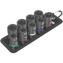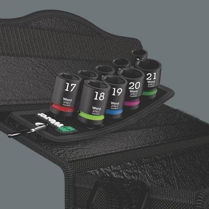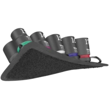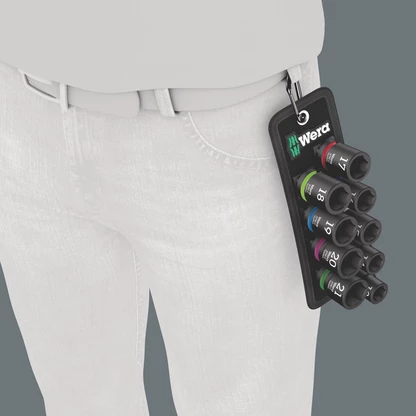 Una correa textil robusta (Belt) en el típico diseño de Wera con 9 llaves de vaso Impaktor en un espacio sumamente compacto. Un mecanismo giratorio de accionamiento suave permite un depósito seguro y una extracción muy fácil de los vasos. Incluye un mosquetón para la fijación en la trabilla del cinturón o en un bolso. La parte posterior con zona de fieltro y la cinta autoadhesiva sirven para una fijación fácil, por ejemplo en la pared, en la estantería, en el carro del taller o en los elementos del sistema de transporte de útiles Wera 2go. Los vasos Impaktor sirven para la aplicación con máquinas atornilladoras eléctricas o taladros neumáticos de golpe con arrastre de 12,5 mm = 1/2". La tecnología "Impaktor" permite unos tiempos de servicio de las llaves de vaso Impaktor por encima del promedio, incluso en el caso de condiciones extremas durante la aplicación. Lleva el sistema de búsqueda de herramientas Take it easy: con marcas a color según el tamaño correspondiente para encontrar la herramienta precisa más fácil- y rápidamente. Con perfil hexagonal y una ranura con taladro. El perfil hexagonal permite una transmisión de fuerzas muy elevadas y no significa una carga tan alta para los cantos de la tuerca o de la cabeza del tornillo como en el caso del perfil bihexagonal. Para tornillos y tuercas de hexágono exterior.