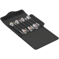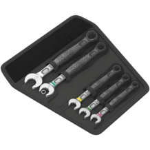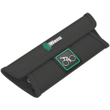 Juego de 5 llaves combinadas Joker 6003 con diseño extrafino del tamaño 15. Como los espacios de trabajo son muy reducidos cuando se atornilla en la bicicleta, se necesitan herramientas con las que los usuarios puedan trabajar con éxito también en esas situaciones. Los espacios de trabajo estrechos requieren puntos de sujeción adicionales para la herramienta. ¿Se pueden modificar las llaves combinadas de manera que aumenten las posibilidades de sujeción de la herramienta? La combinación de la boca girada a 7,5° y la geometría de doble hexágono da como resultado una duplicación de los puntos de sujeción. Con un giro repetido de 180° de la llave alrededor del eje longitudinal durante el apriete, hay cuatro posibilidades de sujeción y las tuercas o cabezas de los tornillos se pueden "agarrar" cada 15°. La Joker 6003, con su ingeniosa geometría de boca, amplía considerablemente la gama de aplicaciones en espacios reducidos. El Joker 6003 encuentra el punto de enganche respectivo después de cada vuelta, por así decirlo, por sí mismo. El lado del anillo, delgado pero robusto, está inclinado a 15° respecto al eje de la herramienta. El revestimiento de alta calidad de la superficie proporciona una alta y duradera protección contra la corrosión. Con el sistema de búsqueda Take it easy: código de colores según tamaños. Las bolsas Joker son adecuadas para su fijación en paredes, estanterías, carros de herramientas y el sistema Wera 2go, gracias al sistema de velcro en la parte posterior.