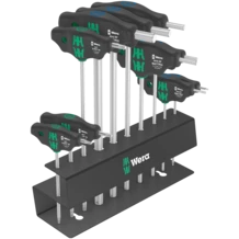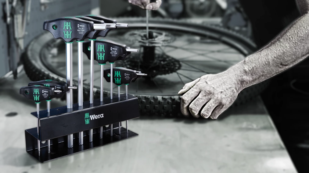 Juego de destornilladores con mango en T de 10 piezas para aplicaciones en bicicletas: La forma ideal del mango permite transmitir pares de apriete y afloje especialmente elevados. La forma ergonómica del mango llena bien la palma de la mano, los dedos descansan con seguridad en los huecos de agarre suavemente redondeados. Toda la mano está en contacto con el mango y se evitan las pérdidas por fricción entre la mano y el mango. Con función de retención en la varilla larga para la sujeción segura de tornillos TORX® y hexagonales (a partir del tamaño 3). Recubrimiento especial de la superficie para una alta protección contra la corrosión y una óptima precisión de ajuste en el tornillo. Con varilla corta adicional para la transmisión de pares extremadamente elevados gracias al efecto de palanca de la varilla larga. Incluye una bandeja metálico para el almacenamiento en el taller.