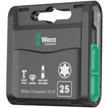 Puntas de alta calidad para tornillos TORX® interior en la caja práctica tipo Bit-Box. La tecnología "Impaktor" permite una vida útil sobreproporcional incluso en caso de unas cargas extremas. La mayor resistencia de fricción que proporciona el recubrimiento rugoso con partículas de diamante en el extremo de la punta evita que la herramienta se salga del tornillo por deslizamiento. Son especialmente adecuadas para la utilización con máquinas atornilladoras de impacto o de golpe usuales en el mercado. Hexagonales de 1/4", aptas para porta-puntas según DIN ISO 1173-D 6,3. Con sistema de búsqueda de herramienta Take it easy: Una marcación a color según el perfil, así como con sellos que indican el tamaño.