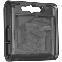La apertura corredera permite extraer y volver a depositar las puntas de forma fácil y dosificada. La parte trasera de la caja es transparente, lo cual permite ver siempre la cantidad de puntas que quedan dentro de la caja..