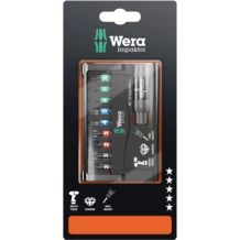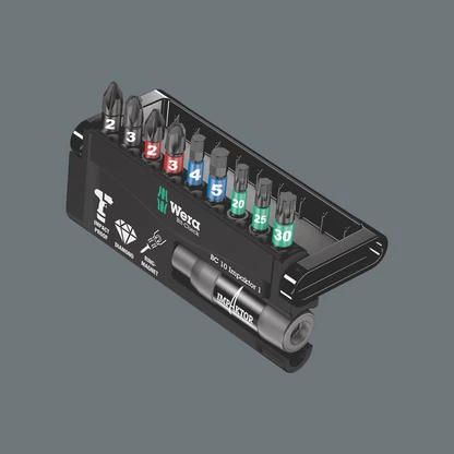 1 porta-puntas Impaktor con anillo de retención y un imán anular, 9 puntas Impaktor. Por medio de un aprovechamiento óptimo de las características del material, así como con ayuda de una geometría óptimamente adaptada, la tecnología "Impaktor" proporciona vidas de servicio sobreproporcionales de la herramienta, incluso en el caso de que se den cargas extremamente altas; es especialmente adecuado para la utilización con máquinas destornilladoras de impacto o de golpe habituales en el comercio. El porta-puntas con imán anular es capaz de sostener fácilmente incluso tornillos largos y pesados. Esto también es ideal para realizar trabajos por encima de la cabeza. La resistencia friccional elevada que produce el recubrimiento con una capa rugosa de partículas de diamante en el extremo de la punta, evita que el útil se salga del tornillo por deslizamiento.
