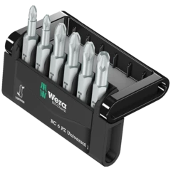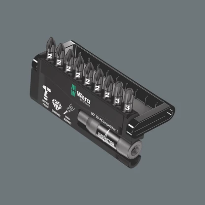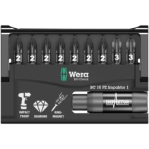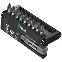 Un Bit-Check robusto de Wera. Los Bit-Check permiten una vista general rápida sobre la herramienta que se tiene. Las puntas que no se necesitan, simplemente se vuelven a guardar en el juego y así no se pierden. El transporte es fácil, por ejemplo, en el bolsillo de la camisa. La tecnología "Impaktor" proporciona vidas útiles sobreproporcionales de la herramienta, incluso en el caso de cargas extremamente altas. La resistencia friccional elevada que produce el recubrimiento con una capa rugosa de partículas de diamante en el extremo de la punta, evita que el útil se salga del tornillo por deslizamiento. El porta-puntas es de tipo Impaktor y logra amortiguar picos de impulso extremos. Se da un efecto torsional especial gracias al muelle torsional doble. Con ayuda de su imán anular, el porta-puntas Impaktor adicionalmente sostiene tornillos largos y pesados de forma supersegura lo cual también supone la solución ideal para trabajos por encima de la cabeza. Especialmente adecuadas para la aplicación con máquinas destornilladoras de impacto/de golpe habituales en el comercio. Es posible desplazar el imán hacia atrás, quedando "desconectado" de esta forma.