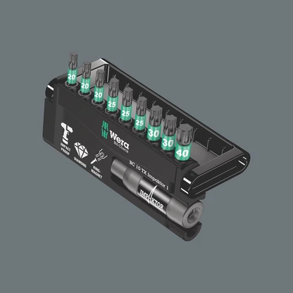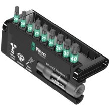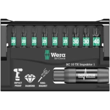 Un Bit-Check robusto de Wera. Los Bit-Check permiten una vista general rápida sobre la herramienta que se tiene. Las puntas que no se necesitan, simplemente se vuelven a guardar en el juego y así no se pierden. El transporte es fácil, por ejemplo, en el bolsillo de la camisa. La tecnología "Impaktor" proporciona vidas útiles sobreproporcionales de la herramienta, incluso en el caso de cargas extremamente altas. La resistencia friccional elevada que produce el recubrimiento con una capa rugosa de partículas de diamante en el extremo de la punta, evita que el útil se salga del tornillo por deslizamiento. El porta-puntas es de tipo Impaktor y logra amortiguar picos de impulso extremos. Se da un efecto torsional especial gracias al muelle torsional doble. Con ayuda de su imán anular, el porta-puntas Impaktor adicionalmente sostiene tornillos largos y pesados de forma supersegura lo cual también supone la solución ideal para trabajos por encima de la cabeza. Especialmente adecuadas para la aplicación con máquinas destornilladoras de impacto/de golpe habituales en el comercio. Es posible desplazar el imán hacia atrás, quedando "desconectado" de esta forma.
