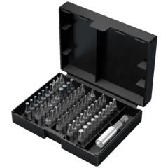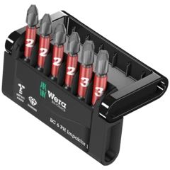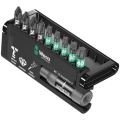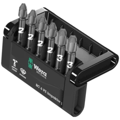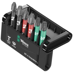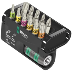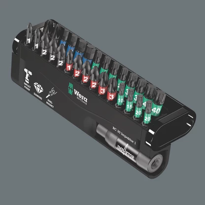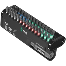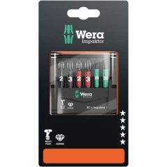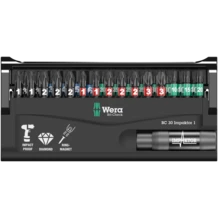1 porta-puntas Impaktor con un anillo de retención y un imán anular, 29 puntas Impaktor. Por medio de un aprovechamiento óptimo de las características del material así como con ayuda de una geometría óptimamente adaptada, la tecnología "Impaktor" proporciona vidas de servicio sobreproporcionales de la herramienta, incluso en el caso de cargas extremamente altas; es especialmente adecuado para la utilización con máquinas destornilladoras de impacto o de golpe habituales en el comercio; con ayuda de su imán anular, el porta-puntas Impaktor sostiene tornillos largos y pesados de forma fácil lo cual también supone la solución ideal para trabajos por encima de la cabeza. Gracias a la resistencia friccional elevada que produce el recubrimiento con una capa rugosa de partículas de diamante en el extremo de las puntas, se evita que el útil se salga del tornillo por deslizamiento.
