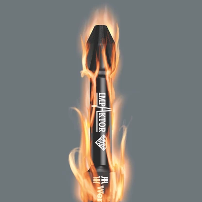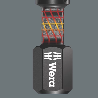 Para unas exigencias máximas de la herramienta de atornillar. Gracias al aprovechamiento de las características del material en combinación con las geometrías especialmente adaptadas a las cargas extremas, así como a unos procesos de elaboración especiales, las herramientas tipo Impaktor de Wera consiguen unos tiempos de servicio por encima del promedio. Una ventaja adicional del producto es el recubrimiento de las puntas con unas partículas minúsculas de diamante. Estas partículas reducen las así llamadas fuerzas de expulsión que en el caso de trabajos a máquina son especialmente altas y pueden conllevar un deslizamiento de la herramienta saliéndose del tornillo. Las partículas de diamante se aferran fuertemente en el tornillo. De esta forma, ya no se tiene que aplicar tanta fuerza de presión lo que reduce claramente la fatiga en trabajos de atornillamiento.