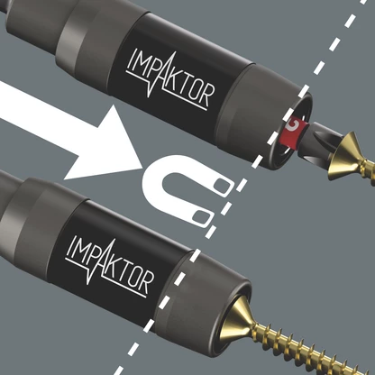 Adicionalmente, el porta-puntas Impaktor con imán anular sostiene tornillos largos y pesados de forma ultra-segura. De esta manera es posible posicionar el tornillo de forma rápida y segura. También se presta idealmente para trabajos por encima de la cabeza. En caso de que no se desee utilizar el imán en ciertas situaciones, por ejemplo en el caso de trabajos en material metálico, es posible retirarlo de la zona de atornillamiento, quedando así “desconectado”. Se aplica especialmente en el caso de atornillado manual con máquina.