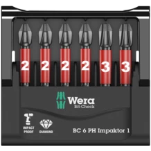 6 puntas Impaktor de Wera alojadas de forma sistemática en un espacio mínimo en el Bit-Check práctico. Por medio de un aprovechamiento óptimo de las características del material así como con ayuda de una geometría óptimamente adaptada, la tecnología "Impaktor" proporciona vidas de servicio sobreproporcionales de la herramienta, incluso en el caso de cargas extremamente altas. El extremo de las puntas está recubierto de diminutas partículas de diamante que gracias a la mayor resistencia friccional que produce este recubrimiento, evita que el útil se salga del tornillo por deslizamiento.