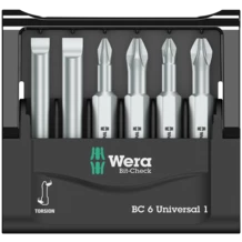 6 puntas de Wera de un largo de 50 mm alojadas de forma sistemática en un espacio mínimo en un Bit-Check práctico. Las puntas duras y resistentes son adecuadas para aplicaciones universales. En el caso de las puntas BiTorsion (TZ), además los picos del par de giro se amortiguan en la zona de torsión. Así se evita el desgaste prematuro y se aumenta la longevidad de la punta.