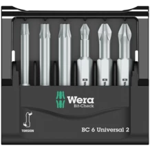 6 puntas de Wera de un largo de 50 mm alojadas de forma sistemática en un espacio mínimo en un Bit-Check práctico. Las puntas duras y resistentes son adecuadas para aplicaciones universales. En el caso de las puntas BiTorsion (TZ), además los picos del par de giro se amortiguan en la zona de torsión. Así se evita el desgaste prematuro y se aumenta la longevidad de la punta.