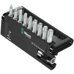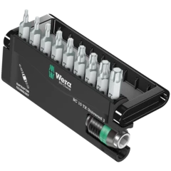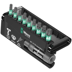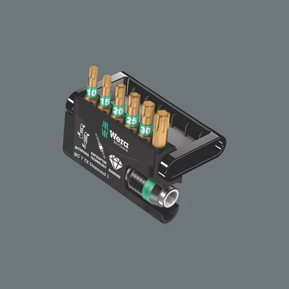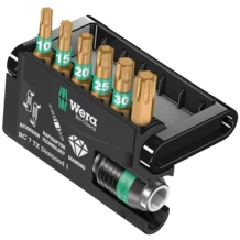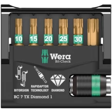 Puntas con partículas diminutas de diamante en sus extremos. Estas partículas proporcionan un alojamiento seguro dentro del tornillo, reducen la presión de prensado necesaria, y disminuyen el riesgo de que la herramienta se resbale del tornillo. Se trata de puntas BiTorsion con una zona de torsión a la cual se deriva la energía cinética en el caso de que aparezcan picos de carga. Así aumenta la longevidad del producto de forma importante. Disponen de la tecnología Rapidaptor que permite la inserción de las puntas incluso sin utilizar el manguito. La desconexión de la punta se realiza por medio de un desplazamiento simple hacia adelante - para un cambio de puntas ultrarrápido, incluso con una sola mano. Son adecuadas para la inserción en la máquina destornilladora o para conectarlas con el portabrocas del taladro electrónico. El Bit-Check multicomponente convence por su peso ligero y sus dimensiones extremamente compactas. El material blando en la parte baja del Bit-Check permite un alojamiento seguro de la herramienta en la caja, y al mismo tiempo facilita su extracción. El perfil y el tamaño de las puntas son fácilmente reconocibles gracias al sistema de búsqueda fácil Take it easy con sus codificaciones a color y su letra claramente visible.