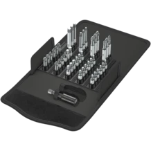 De 43 piezas. En una caja robusta de material textil con puntas para la aplicación universal. Con 1 porta-puntas universal 899/4/1 con manguito de acero inoxidable, anillo de retención y un potente imán permanente para la inserción en la máquina destornilladora o para conectar con el portabrocas del taladro electrónico.