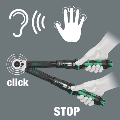 La llave dinamométrica Click-Torque es adecuada para el apriete tanto a la derecha como a la izquierda. El cambio del sentido de giro es muy suave gracias al cuadradillo pasante no perdible.
