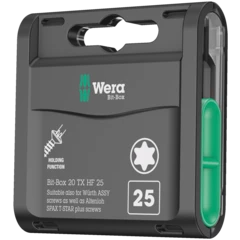 En situaciones de montaje estrechas y difíciles, (por ejemplo en un vano motor), no es posible sostener el tornillo con la mano, de manera segura, para fijarlo en la herramienta que se utiliza para atornillar. Por esto, frecuentemente pasa que el tornillo se escapa y se pierde. La consecuencia puede ser que se desperdicie mucho tiempo al buscar el tornillo, y la pérdida definitiva del tornillo incluso puede ser peligrosa. Las herramientas HF que ha desarrollado Wera, se caracterizan por la optimización del perfil original TORX®. Gracias a la fuerza de apriete que resulta de la presión de superficies entre la punta del destornillador y el perfil del tornillo, los tornillos se sostienen de manera más segura en la herramienta.