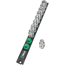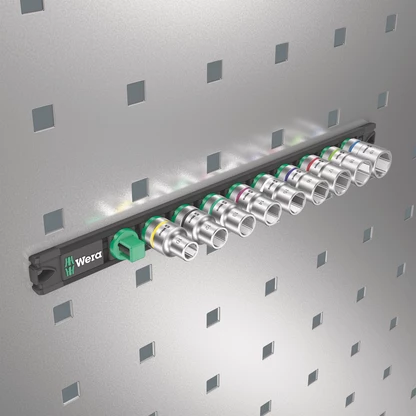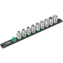 Listón magnético de vasos con 9 llaves de vaso manuales y mecánicas (no de impacto), de 1/2". Un mecanismo giratorio suave permite el alojamiento seguro y la fácil extracción de los vasos. Lleva el sistema de búsqueda de herramientas Take it easy con marcas de colores según el tamaño, lo cual permite encontrar la herramienta precisa de forma rápida y fácil. El listón magnético permite la colocación temporal en superficies metálicas, y gracias a la función Twist to unlock ("gira y desbloquea"), además es posible bloquear y desbloquear los vasos de manera segura.