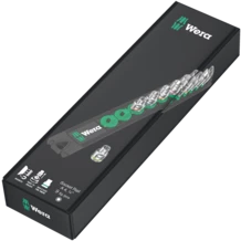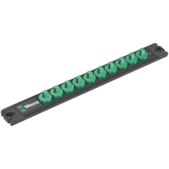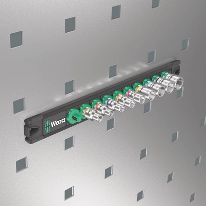 Listón magnético de vasos con 9 llaves de vaso manuales y mecánicas (no de impacto), de 1/4". Un mecanismo giratorio suave permite el alojamiento seguro y la fácil extracción de los vasos. Lleva el sistema de búsqueda de herramientas Take it easy con marcas de colores según el tamaño, lo cual permite encontrar la herramienta precisa de forma rápida y fácil. El listón magnético permite la colocación temporal en superficies metálicas, y gracias a la función Twist to unlock ("gira y desbloquea"), además es posible bloquear y desbloquear los vasos de manera segura.