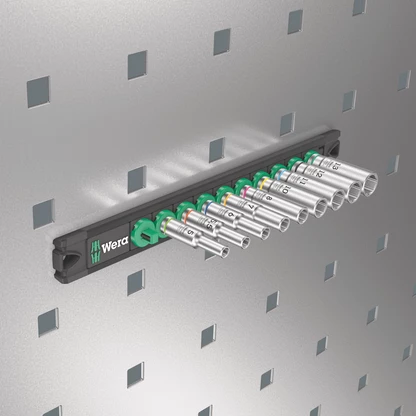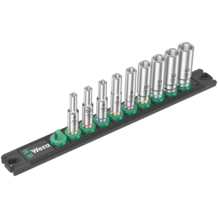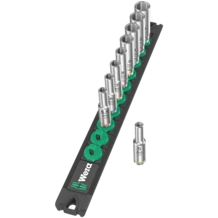 Listón magnético de vasos con 9 llaves de vaso largas, manuales y mecánicas (no de impacto), de 1/4". Un mecanismo giratorio suave permite un alojamiento seguro y una extracción fácil de los vasos. Llaves de vaso largas de ¼" manuales y mecánicas (ISO 2725-parte 3) de Wera para el uso tanto manual como con máquina (no de impacto), incluso en uniones que se encuentran a profundidad y en pernos roscados sobresalientes. Lleva el sistema de búsqueda de herramientas Take it easy, con marcas de colores según el tamaño, lo cual permite encontrar la herramienta de forma precisa, y fácil. Los vasos permiten un buen agarre incluso si el usuario tiene las manos llenas de aceite. Con perfil hexagonal y ranura de captura de bolas. El perfil hexagonal permite la transmisión de altas fuerzas y es menos perjudicial para los cantos de la tuerca del tornillo o para la cabeza del tornillo que un perfil de doce cantos. Además, con las carracas de dientes finos, gracias a su ángulo de retorno muy pequeño, ya no hace falta utilizar el perfil de doce cantos, incluso en espacios de montaje muy estrechos. Las llaves de vaso son adecuadas para tornillos y tuercas hexagonales exteriores. El listón magnético permite la colocación temporal en superficies metálicas, y gracias a la función Twist to unlock ("gira y desbloquea"), además es posible bloquear y desbloquear los vasos de manera segura.