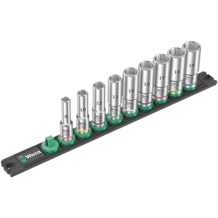 Listón magnético de vasos con 9 llaves de vaso largas, manuales y mecánicas (no de impacto), de 3/8". Un mecanismo giratorio suave permite un alojamiento seguro y una extracción fácil de los vasos. Llaves de vaso largas de 3/8" manuales y mecánicas (ISO 2725-parte 3) de Wera para el uso tanto manual como con máquina (no de impacto), incluso en uniones que se encuentran a profundidad y en pernos roscados sobresalientes. Lleva el sistema de búsqueda de herramientas Take it easy con marcas de colores según el tamaño, lo cual permite encontrar la herramienta de forma precisa, rápida y fácil. Los vasos permiten un buen agarre incluso si el usuario tiene las manos llenas de aceite. Con perfil hexagonal y ranura de captura de bolas. El perfil hexagonal permite la transmisión de altas fuerzas y es menos perjudicial para los cantos de la tuerca del tornillo o para la cabeza del tornillo que un perfil de doce cantos. Además, con las carracas de dientes finos, gracias a su ángulo de retorno muy pequeño, ya no hace falta utilizar el perfil de doce cantos, incluso en espacios de montaje muy estrechos. Las llaves de vaso son adecuadas para tornillos y tuercas hexagonales exteriores. El listón magnético permite la colocación temporal en superficies metálicas, y gracias a la función Twist to unlock ("gira y desbloquea"), además es posible bloquear y desbloquear los vasos de manera segura.