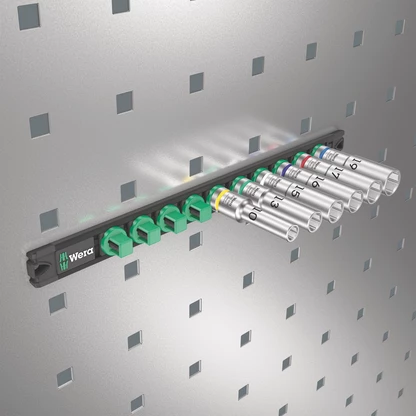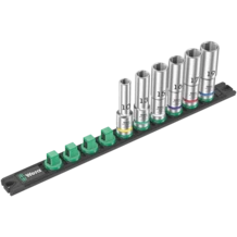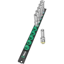 Listón magnético de vasos con 6 llaves de vaso largas, manuales y mecánicas (no de impacto), de 1/2". Un mecanismo giratorio suave permite un alojamiento seguro y una extracción fácil de los vasos. Llaves de vaso largas de 1/2" manuales y mecánicas (ISO 2725-parte 3) de Wera para el uso tanto manual como con máquina (no de impacto), incluso en uniones que se encuentran a profundidad y en pernos roscados sobresalientes. Lleva el sistema de búsqueda de herramientas Take it easy, con marcas de colores según el tamaño, lo cual permite encontrar la herramienta de forma precisa, rápida y fácil. Los vasos permiten un buen agarre incluso si el usuario tiene las manos llenas de aceite. Con perfil hexagonal y ranura de captura de bolas. El perfil hexagonal permite la transmisión de altas fuerzas y es menos perjudicial para los cantos de la tuerca del tornillo o para la cabeza del tornillo que un perfil de doce cantos. Además, con las carracas de dientes finos, gracias a su ángulo de retorno muy pequeño, ya no hace falta utilizar el perfil de doce cantos, incluso en espacios de montaje muy estrechos. Las llaves de vaso son adecuadas para tornillos y tuercas hexagonales exteriores. El listón magnético permite la colocación temporal en superficies metálicas, y gracias a la función Twist to unlock ("gira y desbloquea"), además es posible bloquear y desbloquear los vasos de manera segura.