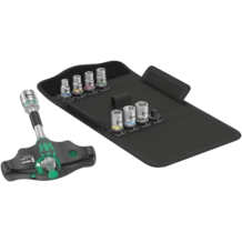 Juego de 9 piezas en un estuche robusto de material textil. 1 destornillador de adaptación de mango en "T" 411 A RA con función de carraca, para vasos de llave de 1/4". La carraca integrada con dentado fino (80 dientes/ángulo de retorno de 4,5°) facilita y acelera el trabajo en uniones atornilladas y evita las molestias de tener que reposicionar el útil constantemente. El mecanismo de carraca que está integrado de forma completa en el mango, permite un trabajo sumamente práctico y agradable. Con una palanca de conmutación para realizar el cambio de giro derecha/izquierda cómodamente con una sola mano. La forma ergonómica del mango rellena toda la palma de la mano, los dedos se encuentran ubicados de manera segura en las cavidades suavemente redondeadas del mango. Así toda la mano entra en contacto con el mango y se evitan las pérdidas por fricción entre mano y mango.Para llaves de vaso de cuadradillo de 1/4" y piezas de conexión de 1/4" con arrastre de cuadradillo, con bloqueo de bola. 8 vasos de llave Zyklop de arrastre de 1/4". Lleva el sistema de búsqueda rápida de la herramienta Take it easy, con marcas a color según el perfil que permite encontrar la herramienta precisa de forma fácil y rápida.