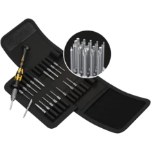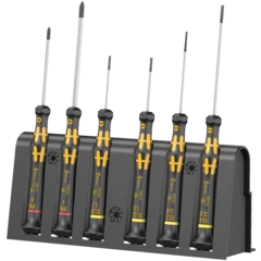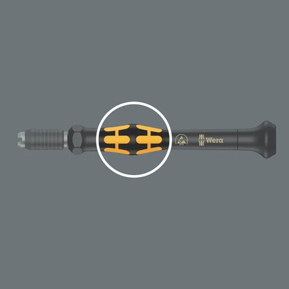 Juego Kraftform Kompakt Micro para aplicaciones de mecánica de precisión. Adecuado para la toma de puntas con arrastre tipo Halfmoon de 4 mm (serie Wera 9) y puntas con arrastre de tipo HIOS de 4 mm (serie Wera 21). Una resistencia eléctrica superficial de ≤ 109 ohmios para una protección segura ante energía electroestática. Elaborado según la norma DIN EN 61340-5-1. Un sistema compacto de mango y varilla intercambiable para un cambio ultrarrápido de las varilla. Mango Kraftform Micro con sombrerete giratorio y una zona de giro rápido para un retorcimiento ultrarrápido, sin que haya que perder tiempo al cambiar de agarre una y otra vez. Zona de potencia con zonas blandas que lleva integradas, para la transmisión de pares altos de apriete y desapriete. Una zona de precisión directamente por encima de la varilla para obtener el ángulo de giro correcto en trabajos de ajuste. Puntas para trabajos de uniones atornilladas tanto manuales como mecánicos. Una fijación de las puntas superrápida: simplemente desplazar la punta hacia la toma del manguito, el bloqueo sucede autónomamente y la posición queda asegurada. Para cambiar la punta, simplemente desplazar el manguito hacia adelante y extraer la punta. El manguito de accionamiento es de carrera libre, para una guía más sencilla de la herramienta durante la acción de atornillar.