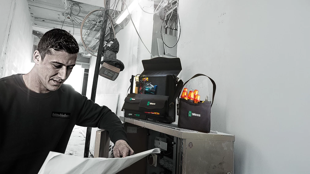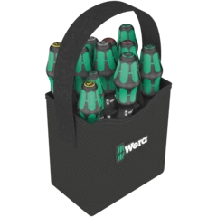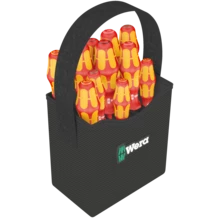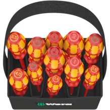 11 destornilladores Kraftform de aislamiento VDE; con el sistema de búsqueda de herramienta "Take it easy"; dentro del cestillo Wera 2go 4. Con una división del espacio ajustable para una adaptación muy individual del sistema.
