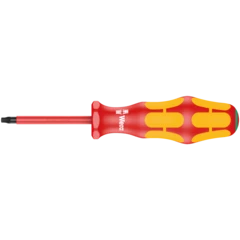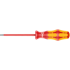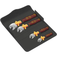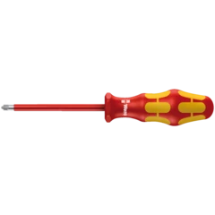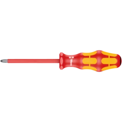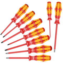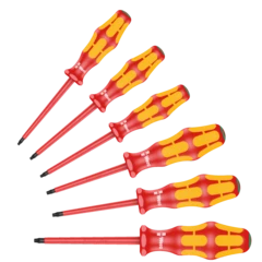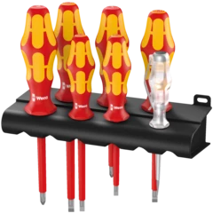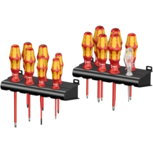 Juego de destornilladores de 14 piezas con destornilladores aislados, probados pieza por pieza según la norma IEC 60900. La prueba individual se realiza pieza por pieza a 10.000 V para poder garantizar un trabajo seguro a una tensión permitida de 1.000 V. El mango es tipo Kraftform Plus para poder garantizar un trabajo agradable y ergonómico sin que se produzcan ampollas o callosidades. Las zonas duras de agarre permiten una gran velocidad de trabajo mientras que las zonas blandas de agarre garantizan la transmisión de altos pares de giro. En parte llevan Lasertip: la punta se aferra fuertemente a la cabeza del tornillo y evita así que el útil involuntariamente se desprenda del tornillo por deslizamiento. Con sistema de búsqueda de herramienta Take it easy: marcas de color según el perfil y sellos con el tamaño. El sistema de protección contra el rodamiento evita las molestias que conlleva el perder la herramienta que se rueda en el puesto de trabajo. El juego incluye un probador de fases y 2 bandejas para depositar los útiles.