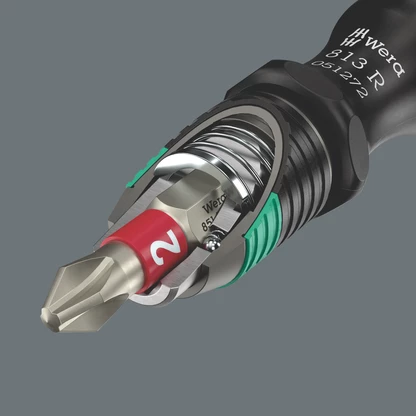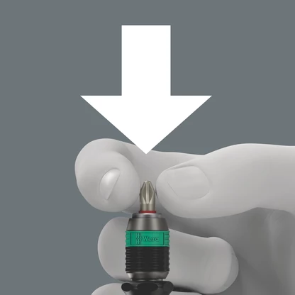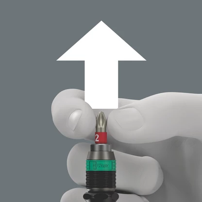 Para cambiar la punta simplemente se ha de desplazar el casquillo hacia adelante: En ese instante, el mecanismo de muelle separa la punta del imán y desbloquea así la herramienta. La punta se puede extraer sin problema alguno. Y lo que es especialmente útil: esta función también permite la extracción de puntas de dimensiones muy pequeñas sin que se tenga que utilizar herramienta adicional de ayuda.