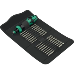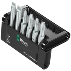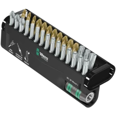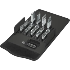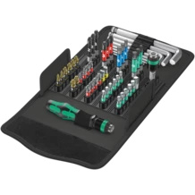 De 52 piezas; vienen en una caja de material textil compacta que protege las superficies delicadas y que dispone de gran robustez. El juego se caracteriza por un volumen y un peso muy bajos lo que proporciona una mejor movilidad. Se trata de un juego compacto de útiles con 52 herramientas de atornillar. 1 porta-puntas manual Rapidaptor con sistema de cambio rápido; 1 porta-puntas B Rapidaptor con sistema de cambio rápido para la inserción en la máquina destornilladora o la conexión con el taladro electrónico; 30 puntas BiTorsion con un largo de 25 mm para una vida útil más larga, duras y resistentes (BTZ), para la aplicación universal, extra-duras (BTH), 12 puntas Impaktor con un largo de 50 mm para aplicaciones especialmente ambiciosas, 8 llaves acodadas con perfil Hex-Plus (evita el desgaste por redondeo de tornillos de hexágono interior) y una bola hexagonal en el brazo largo para trabajos en esquinas o "doblando la esquina"; la caja de material textil se caracteriza por su gran robustez y longevidad; se puede depositar de forma vertical en la estantería del taller; el material textil exterior ofrece una protección adicional de superficies de trabajo delicadas.