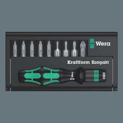9 puntas de Wera. 1 porta-puntas 813 R Kraftform con sistema de cambio rápido Rapidaptor, multicomponente, para grandes velocidades de trabajo y una mayor ergonomía al realizar uniones atornilladas.