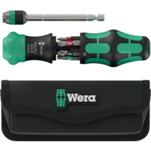 Mango Kraftform con recámara de puntas integrada en el mango para 6 puntas; con varilla telescópica; para puntas de 1/4". La carraca que se encuentra integrada en el mango dispone de un dentado fino, y permite un trabajo muy veloz. La conmutación del sentido de giro sucede de forma intuitiva: al girar el conmutador anular hacia la derecha, se atornilla en dirección hacia la derecha, y al girar el conmutador anular hacia la izquierda, se atornilla hacia la izquierda. Para realizar trabajos de precisión, el mecanismo de carraca puede desactivarse por medio de la posición 0. La varilla telescópica retractable en el mango con el sistema Rapidaptor de cambio rápido, permite trabajos manuales de atornillar incluso en espacios de trabajo muy reducidos, cuando la varilla se encuentra retractada en el mango. Para que salga la varilla telescópica, simplemente se ha de accionar el manguito de bloqueo. Ahora, la herramienta se puede utilizar como un destornillador plenamente válido. La varilla telescópica se puede extraer , y se puede utilizar como adaptador de la máquina atornilladora, o también puede ser devuelta a su posición inicial. La tecnología Rapidaptor del porta-puntas permite un cambio rápido de las puntas. Incluye 6 puntas BiTorsion para una larga vida útil, duras y resistentes, para el uso universal; éstas se alojan en la recámara de puntas que está integrada en el mango. El fuerte imán permanente que se encuentra en la toma de puntas de 1/4", garantiza un alojamiento seguro de la punta. El mango Kraftform bicomponente con su combinación de zonas duras y blandas, permite un agarre fuerte y un trabjajo sumamente preciso. El útil viene en un bolso robusto.