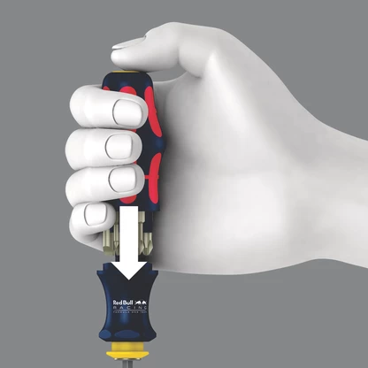 Imprescindible para todos los amantes del motorismo que exigen una herramienta de altísima calidad: La herramienta compacta Red Bull Racing con 6 puntas de atornilladora de acero inoxidable en el mango - made by Wera. El juego permite la doble aplicación de las dos formas de atornillar: a mano y a máquina. La varilla tipo bayoneta retractable en el mango que además lleva el sistema de cambio rápido, permite trabajos en uniones atornilladas incluso en espacios de montaje sumamente estrechos. Adicionalmente, la varilla se puede extraer y colocar en una máquina atornilladora. Con mango de destornilladores Kraftform: zonas de agarre duras para altas velocidades de trabajo, zonas de agarre blandas para una alta transmisión de la fuerza. Viene en un bolso muy práctico para el cinturón en el diseño de Red Bull Racing. El lado trasero del bolso lleva una superficie cubierta de fieltro. Además está previsto de una cinta autoadhesiva para la fijación del bolso en cualquier superficie.
