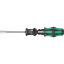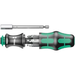 Una herramienta compacta con un mango multicomponente Kraftform para unas altas velocidades de trabajo y un trabajo en uniones atornilladas especialmente ergonómico. El mango lleva integrada una recámara de puntas con 6 puntas duras y resistentes para el uso universal. El porta-puntas lleva un potente imán permanente para un posicionamiento seguro de la punta.