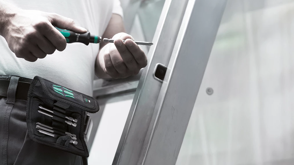 Los útiles se guardan y se transportan en un bolso muy robusto que se puede llevar en el cinturón. De esta manera, la herramienta siempre se encuentra a mano.