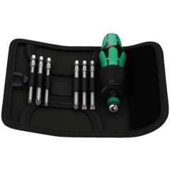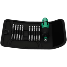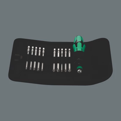 Bolso plegable con puntas de 89 mm de largo. Incluye un destornillador dinamométrico 816 R Kraftform con sistema de cambio rápido "Rapidaptor" y el mango multicomponente tipo Kraftform para un trabajo menos fatigoso.