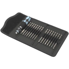 Bolso plegable con puntas de un largo de 89 mm. Incluye 1 porta-puntas manual 3816 R Kraftform con sistema de cambio rápido "Rapidaptor" y un mango tipo Kraftform multicomponente para un trabajo menos fatigoso. Versión de acero inoxidable para evitar la formación de herrumbre de origen externo. Juego de 17 piezas.