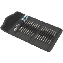 Bolso plegable con puntas de un largo de 89 mm. Incluye 1 porta-puntas manual 3816 R Kraftform con sistema de cambio rápido "Rapidaptor" y un mango tipo Kraftform multicomponente para un trabajo menos fatigoso. Versión de acero inoxidable para evitar la formación de herrumbre de origen externo. Juego de 17 piezas.