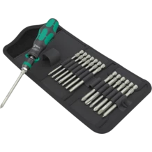 Juego de 15 piezas de destornilladores carraca. Porta-puntas manual con una función de carraca que se puede manejar de manera intuitva. La mecánica de carraca con dentado fino (36 dientes/ángulo de retorno del 10°) que está integrada en el mango, facilita y acelera los trabajos en uniones atornilladas sin tener que volver a reiniciar el movimiento constantemente de manera trabajosa. Incluso es posible trabajar con movimientos rotatorios rápidos. La mecánica de carraca que se encuentra integrada completamente en el mango, permite un trabajo muy práctico y descomplicado. Una conmutación ergonómica a la posición derecha/izquierda, o a la posición de 0. El mango Kraftform Plus permite un trabajo ergonómico agradable que evita la formación de ampollas y callosidades en las manos del usuario. Un porta-puntas magnético para puntas de arrastre hexagonal exterior de 1/4" según DIN ISO 1173-C 6,3 y E 6,3 (ISO 1173). El sistema de cambio rápido Rapidaptor permite un cambio de puntas ultrarrápido sin herramienta auxiliar. El fuerte imán permanente sostiene las puntas de forma supersegura. 13 puntas duras y resistentes para el uso universal (ranura en cruz Phillips y Pozidriv, TORX®, ranura y hexágono interior), de un largo de 89 mm; con con un niquelado químico.
