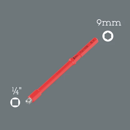 Una varilla de adaptación aislada. La varilla adapta de hexágono exterior de 9 mm a cuadradillo exterior de 1/4". Se puede utilizar con los porta-puntas aislados Kraftform Kompakt VDE de Wera con toma de hexágono interior de 9 mm. Es adecuada para llaves de vaso (vasos) aislados de Wera de 1/4" así como para vasos de punta de 1/4". La herramienta ha sido probada de manera individual en un 100 % según IEC 60900 a una tensión de 10.000 voltios para garantizar un trabajo seguro bajo la tensión permitida de 1.000 voltios.