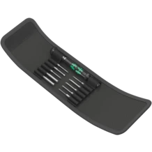 Juego Kraftform Kompakt Micro para aplicaciones de mecánica de precisión. Adecuado para la toma de puntas con arrastre tipo Halfmoon de 4 mm (serie Wera 9) y puntas con arrastre de tipo HIOS de 4 mm (serie Wera 21). Un sistema compacto de mango y varilla intercambiable para un cambio ultrarrápido de las varillas. Mango Kraftform Micro con sombrerete giratorio y una zona de giro rápido para un retorcimiento ultrarrápido, sin que haya que perder tiempo al cambiar de agarre una y otra vez. Zona de potencia con zonas blandas que lleva integradas, para la transmisión de pares altos de apriete y desapriete. Una zona de precisión directamente por encima de la varilla para obtener el ángulo de giro correcto en trabajos de ajuste. Con 10 puntas para trabajos en uniones atornilladas tanto mecánicos como manuales. Una fijación de las puntas superrápida: simplemente desplazar la punta hacia la toma del manguito, el bloqueo sucede autónomamente y la posición queda asegurada. Para cambiar la punta, simplemente desplazar el manguito hacia adelante y extraer la punta. El manguito de accionamiento es de carrera libre, para una guía más sencilla de la herramienta durante la acción de atornillar.