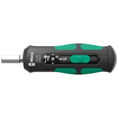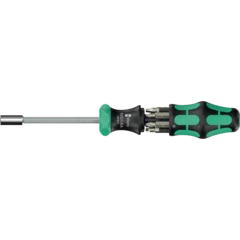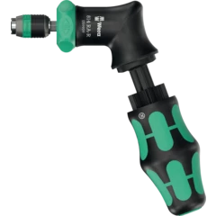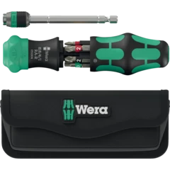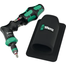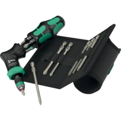 Un mango tipo pistola para puntas de 1/4". La carraca que se encuentra integrada en el mango dispone de un dentado fino y permite un trabajo muy veloz. La conmutación del sentido de giro sucede de forma intuitiva: al girar el conmutador anular hacia la derecha, se atornilla en dirección hacia la derecha, y al girar el conmutador anular hacia la izquierda, se atornilla hacia la izquierda. Para realizar trabajos de precisión, el mecanismo de carraca puede desactivarse por medio de la posición 0. La tecnología Rapidaptor del porta-puntas permite un cambio rápido de las puntas. Incluye 6 puntas BiTorsion para una larga vida útil, duras y resistentes, para el uso universal; las puntas se encuentran dentro de la recámara de puntas que integra el mango. El fuerte imán permanente que se encuentra en la toma de las puntas de 1/4", proporciona un alojamiento seguro de la punta. El mango Kraftform bicomponente tipo pistola permite un efecto de palanca excelente. El bolso robusto tipo pistolera de material textil puede ser fijado en el cinturón.