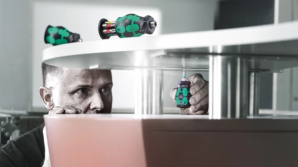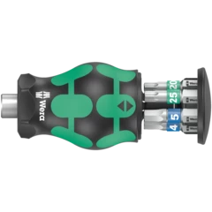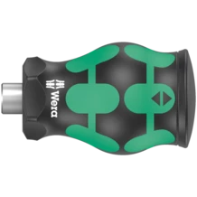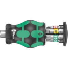 Un destornillador porta-puntas particularmente pequeño y corto para las zonas de difícil acceso. Incluye 6 puntas, que se almacenan en la recámara del mango. Con una longitud total de sólo 65 mm, el Kraftform Kompakt Stubby es un verdadero mini taller de atornillado. El potente imán en el receptáculo de la punta asegura que esta se mantenga sujeta. El mango Kraftform bicomponente con su práctica combinación de zonas duras y blandas permite un agarre firme y un trabajo preciso. Sistema de búsqueda Take it easy: los distintos colores para cada perfil y el marcado del tamaño permiten diferenciar las puntas de forma sencilla.
